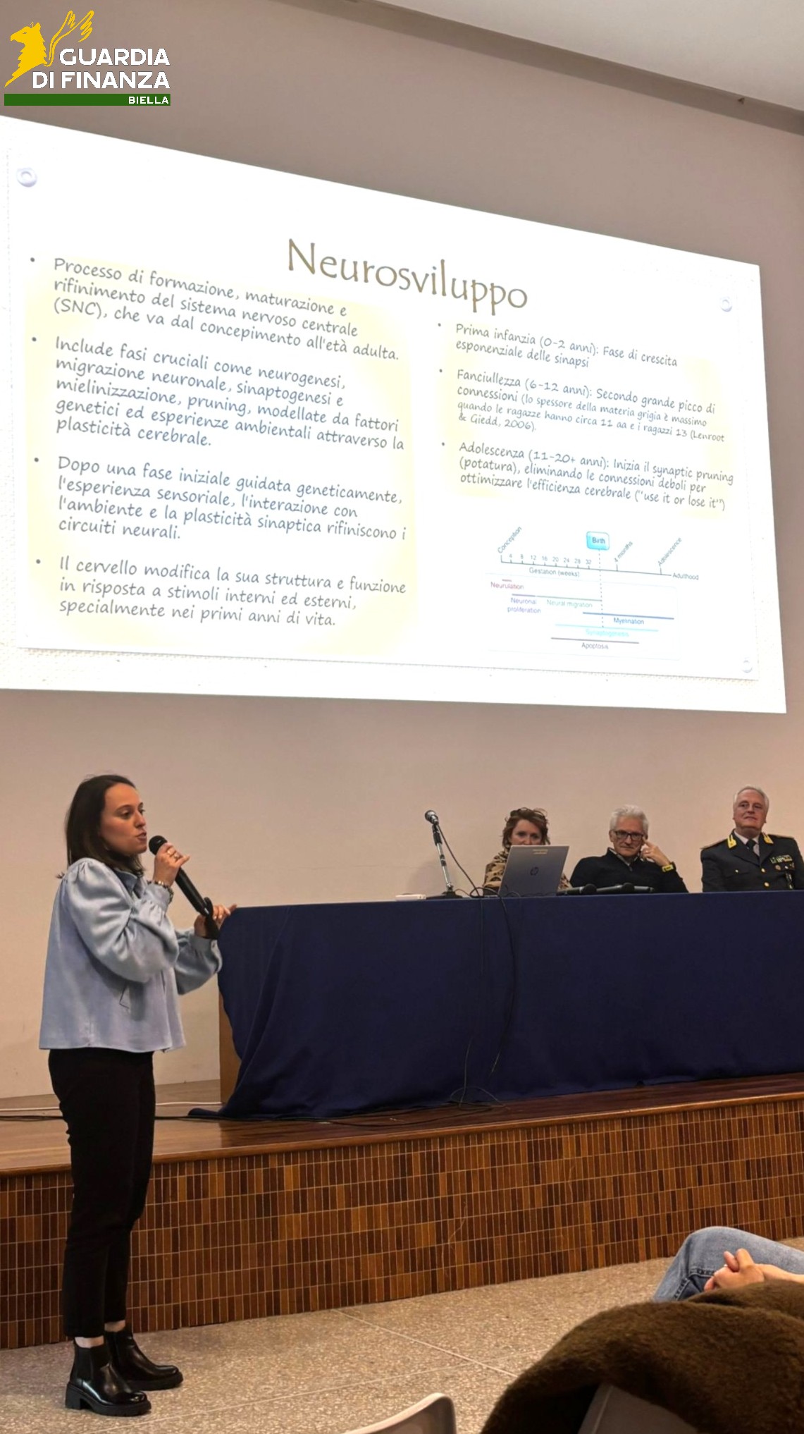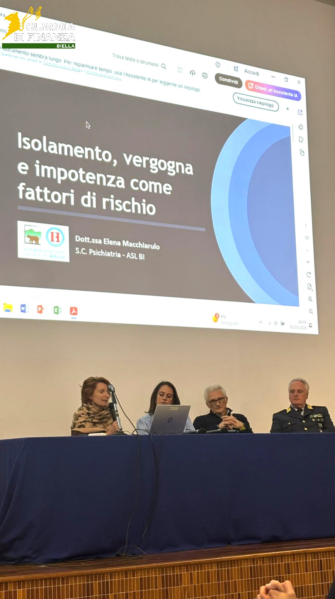 A seguire, si sono alternati, il colonnello Stefano Lampone, comandante provinciale della Guardia di Finanza, che ha affrontato i temi “prevenzione e repressione della violenza giovanile: quadro giuridico, responsabilità e tutele per minori, esercenti la potestà genitoriale e docenti” e “Forze di Polizia e Istituzioni Scolastiche: dall’educazione alla legalità, anche economica, al presidio di sicurezza”, il dottor Fabrizio Forzan, psicologo della Struttura Complessa di Neuropsichiatria Infantile (NPI) dell’ASL di Biella (referente per il bullismo), che ha trattato delle “forme di prevaricazione negli adolescenti: bullismo e cyberbullismo”, la dottoressa Elena Macchiarulo, psicologa e psicoterapeuta della Struttura Complessa Psichiatria della stessa ASL (referente progetti scuole), con un intervento incentrato su “isolamento, vergogna e impotenza come fattori di rischio”, e la dottoressa Maela Beccaria, psicologa e psicoterapeuta della Struttura Complessa Servizio per le Dipendenze (SerD), sempre dell’ASL di Biella (responsabile progetto per gli studenti “unplugged”), che ha approfondito i “comportamenti a rischio in adolescenza”.