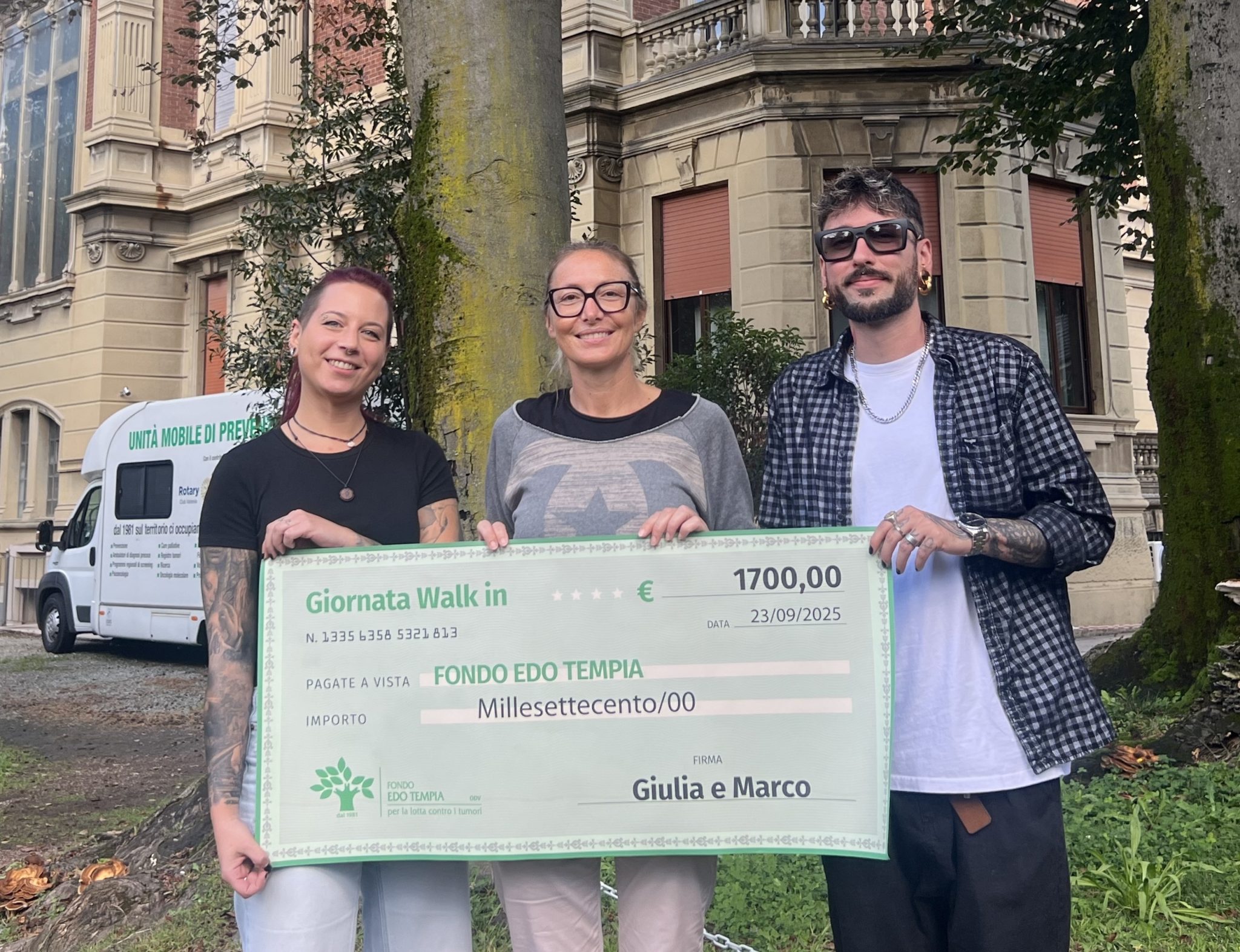 L’iniziativa è al secondo anno e per la prima volta la scelta dei due artisti è caduta sul Fondo Edo Tempia, la cui sede peraltro è a pochi passi da quello studio. Il grande assegno simbolico è stato consegnato nelle mani di Viola Erdini, presidente della Fondazione Tempia e vicepresidente del Fondo: «Gesti generosi come quello di Giulia e Marco» ha detto «sono preziosi non solo per il sostegno concreto ma per il messaggio di solidarietà che contribuiscono a diffondere: la nostra associazione vive e cresce grazie alla gente che non fa mai mancare il suo sostegno». Il messaggio dei due artisti invece era già arrivato via social: «Un grazie enorme a tutti quelli che sono passato e anche a chi ha deciso di donare senza tatuarsi o farsi un piercing. È sempre bello vedere quanta energia e quanta voglia di fare del bene ci sia quando ci si unisce per una giusta causa». La scelta dei due donatori è stata di destinare il loro sostegno al Progetto Bambini, il complesso di misure che offrono appoggio alle famiglie in un momento doloroso e delicato per tutti i suoi componenti, particolarmente quando ad ammalarsi è un figlio o un genitore.