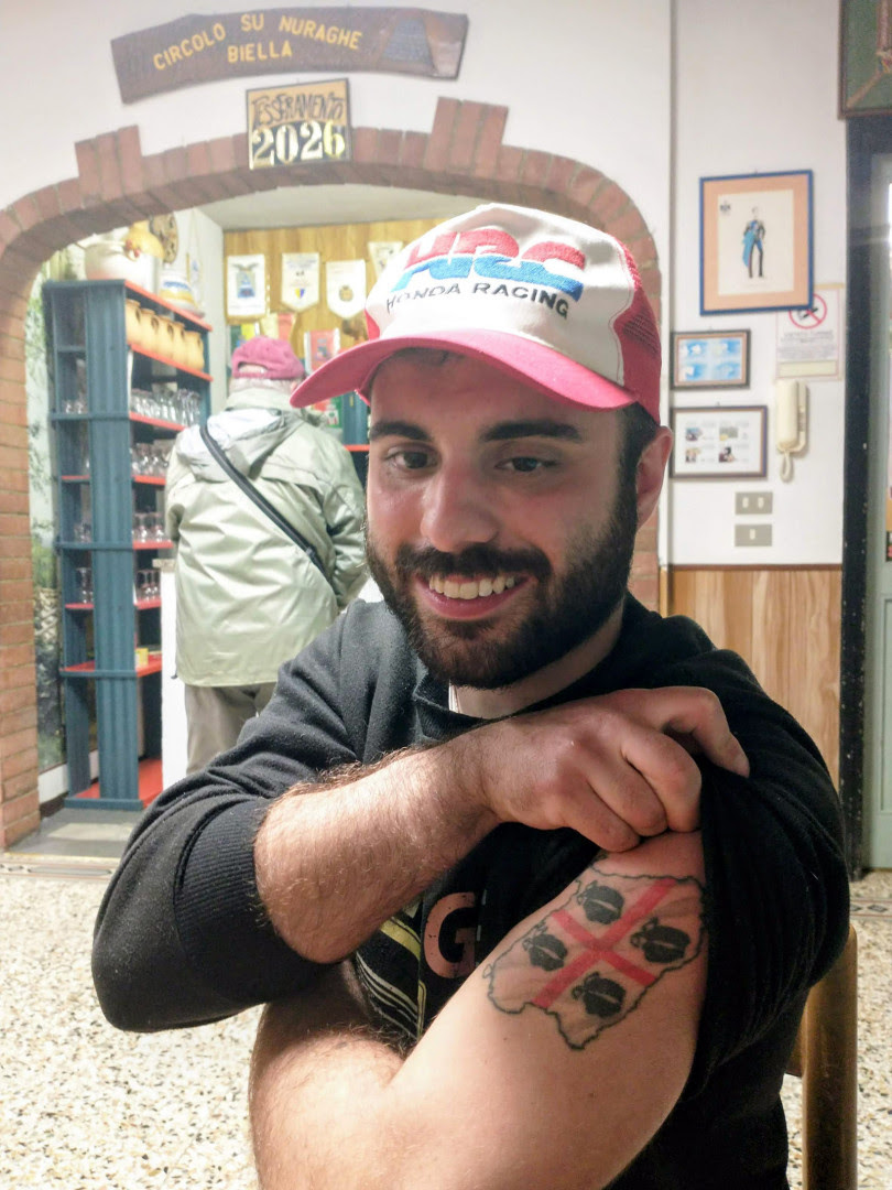 La quotidianità è fatta anche di lavoro, quello in fonderia, duro e concreto, dal quale Manuel ritaglia spazi di libertà per coltivare le sue passioni. Ma è nel cuore che custodisce il suo vero approdo: la Sardegna. Lo racconta senza bisogno di parole, mostrando con orgoglio il tatuaggio sul braccio sinistro, i Quattro Mori racchiusi nel profilo dell’isola. Un segno indelebile, come l’identità che porta con sé.