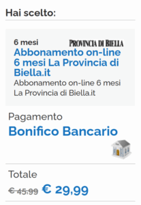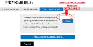 Bastano pochi clic. Bisogna collegarsi a www.laprovinciadibiella.it e accedere alla sezione “abbonamenti”, in fondo alla homepage del sito. Una volta selezionato l’abbonamento semestrale da 45,99 euro, prima di concludere l’acquisto si dovrà inserire il codice BIELLABF25 nell’apposita casella, così lo sconto verrà conteggiato automaticamente e il prezzo scenderà a 29,99 euro. Ma soltanto da lunedì 24 novembre a lunedì 1º dicembre.