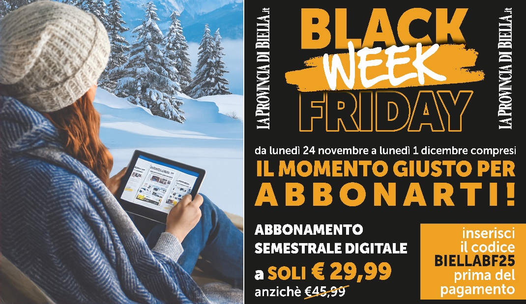 Fino al 1º dicembre maxi promozione sull’abbonamento semestrale all’edizione sfogliabile on line del nostro giornale: 29,99 euro, anziché 45,99. Per ottenere lo sconto bisogna inserire il codice BIELLABF25 nell’apposito campo