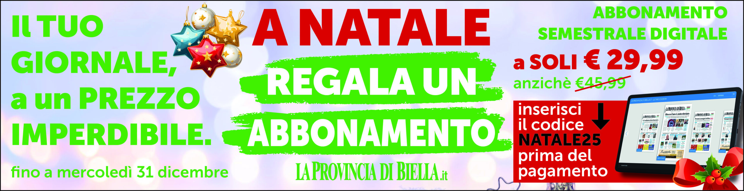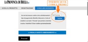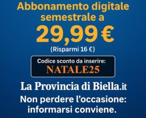 Bastano pochi clic. Bisogna collegarsi a www.laprovinciadibiella.it e accedere alla sezione “abbonamenti”, in fondo alla homepage del sito. Una volta selezionato l’abbonamento semestrale da 45,99 euro, prima di concludere l’acquisto si dovrà inserire il codice NATALE25 nell’apposita casella, così lo sconto verrà conteggiato automaticamente e il prezzo scenderà a 29,99 euro. Ma soltanto fino al 31 dicembre.