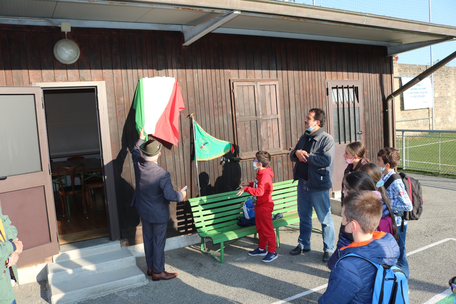 La targa è stata posata nella casetta di legno dell’oratorio. La semplice cerimonia è stata accompagnata dai canti dei bambini della scuola.
