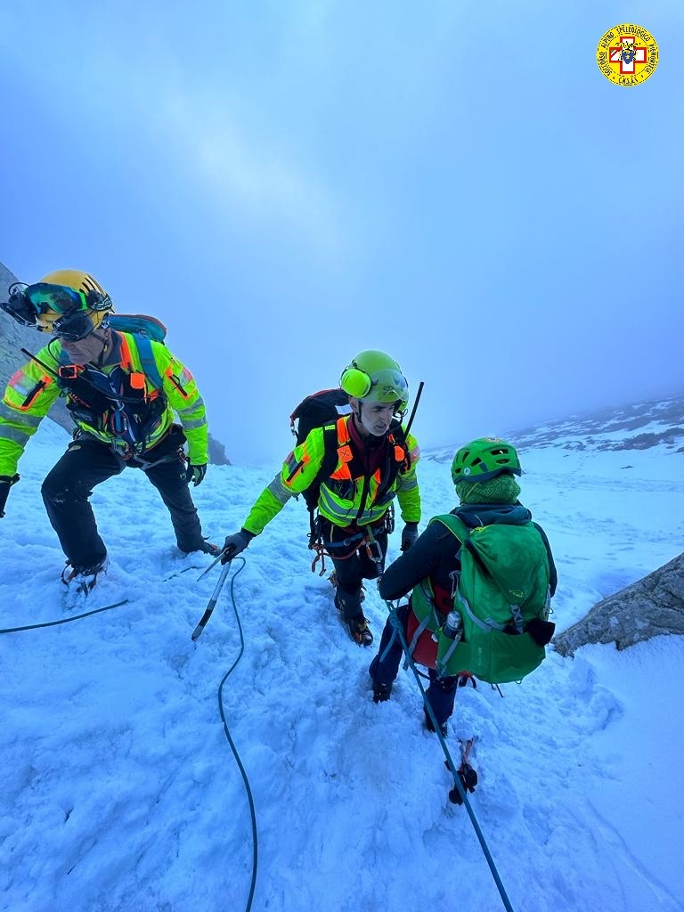 Con progressione alpinistica su terreno misto di roccia e ghiaccio, la donna è stata raggiunta, messa in sicurezza e calata verso valle fino a un punto libero dalla nebbia dove l’intera comitiva è stata nuovamente imbarcata e trasportata a valle.