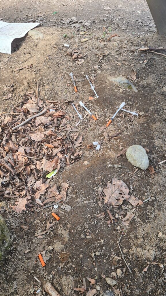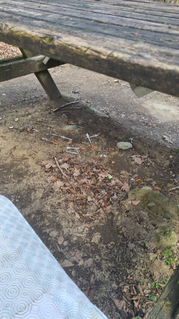 Sono immagini difficili da digerire quelle pubblicate da una donna su Facebook, che ritraggono svariate siringhe gettate a terra sotto il tavolo dell’area attrezzata al Gorgomoro.