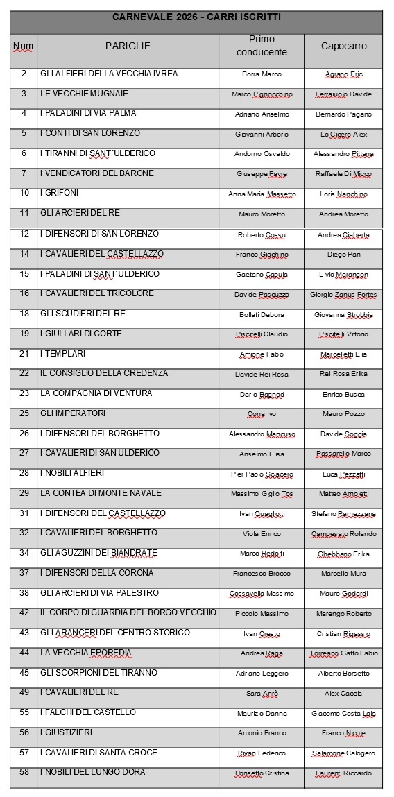 Sono 51 i carri da getto che prenderanno parte alla Battaglia delle Arance. La Fondazione dello Storico Carnevale di Ivrea informa che nei giorni 15 e 16 gennaio 2026 sono pervenute 52 domande di iscrizione di carri da getto per la partecipazione alla Battaglia delle Arance dell’edizione 2026, a fronte dei 54 carri aventi diritto in seguito alla fase di pre-iscrizione.