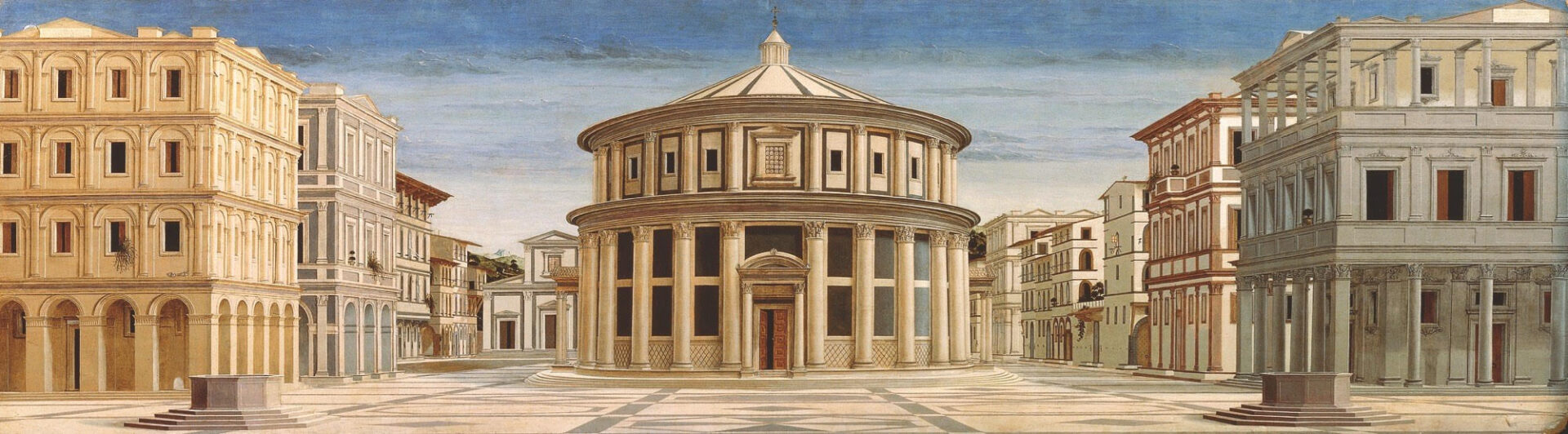Non sono un critico d’arte, ovvio, ma come non andare con il pensiero al celebre dipinto rinascimentale della “Città Ideale”, quadro misterioso ed affascinante oggi in quel di Urbino (vedi foto 2). Ironia a parte, come non cogliere una “evidente similitudine” tra i due dipinti e le due città – sia nella prospettiva (si dice così…) che nella realtà delle cose.