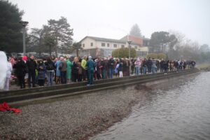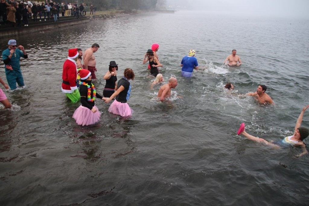 Nonostante il freddo, verso le 11 hanno raggiunto la riva del lago e si sono tuffati, dopo un conto alla rovescia improvvisato.